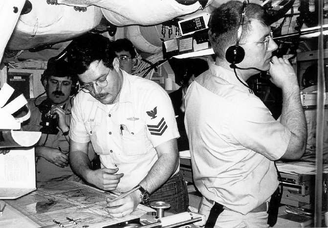From the left: ETC/SS Mooney, me, ET2/SS Mike Harrsch (partially hidden behind me), and the Navigator, LT Jeffrey Long, holding the 27MC mike; he stands between the primary and secondary plots so that if we lose visuals, all he has to do is turn around.